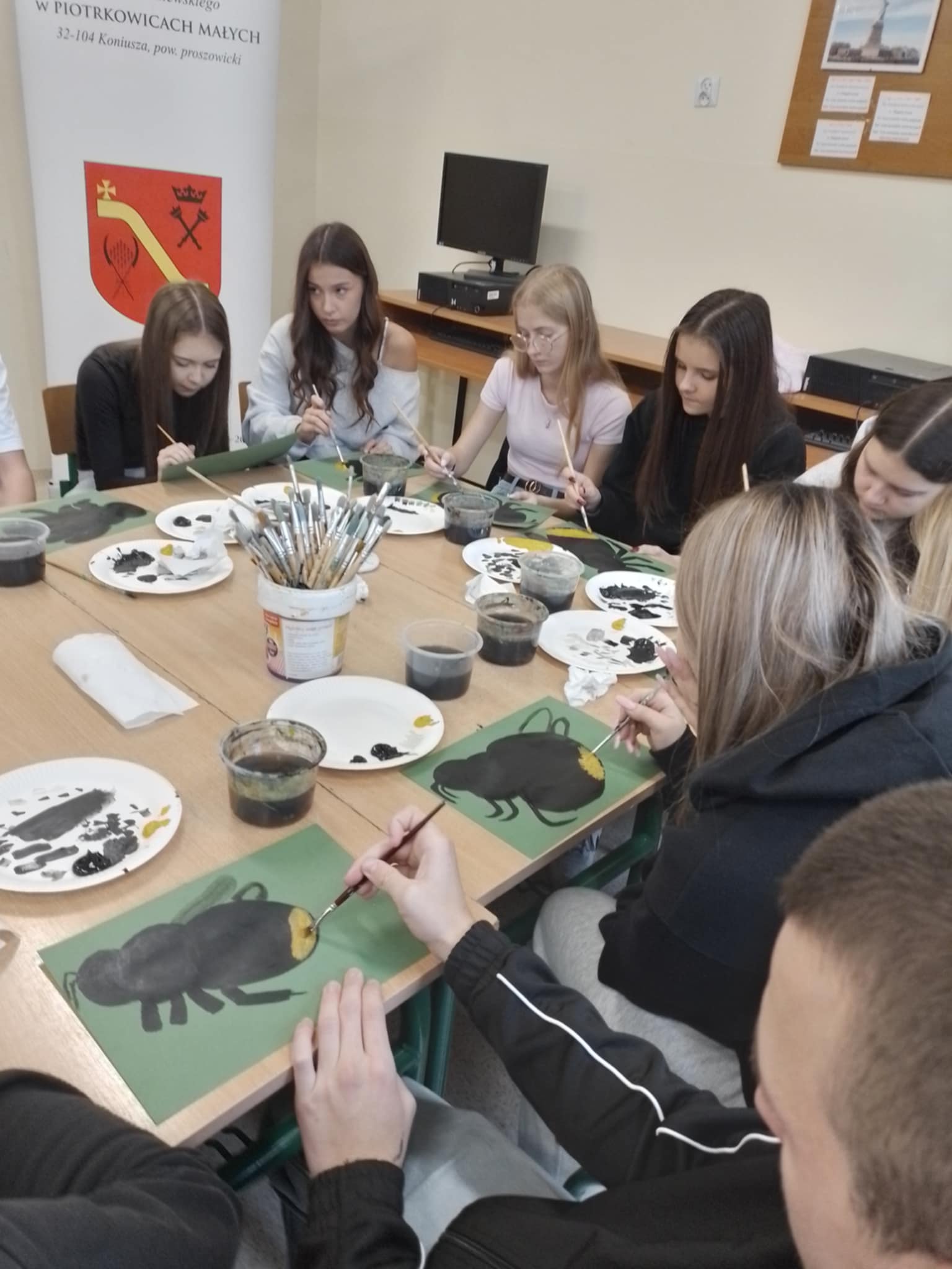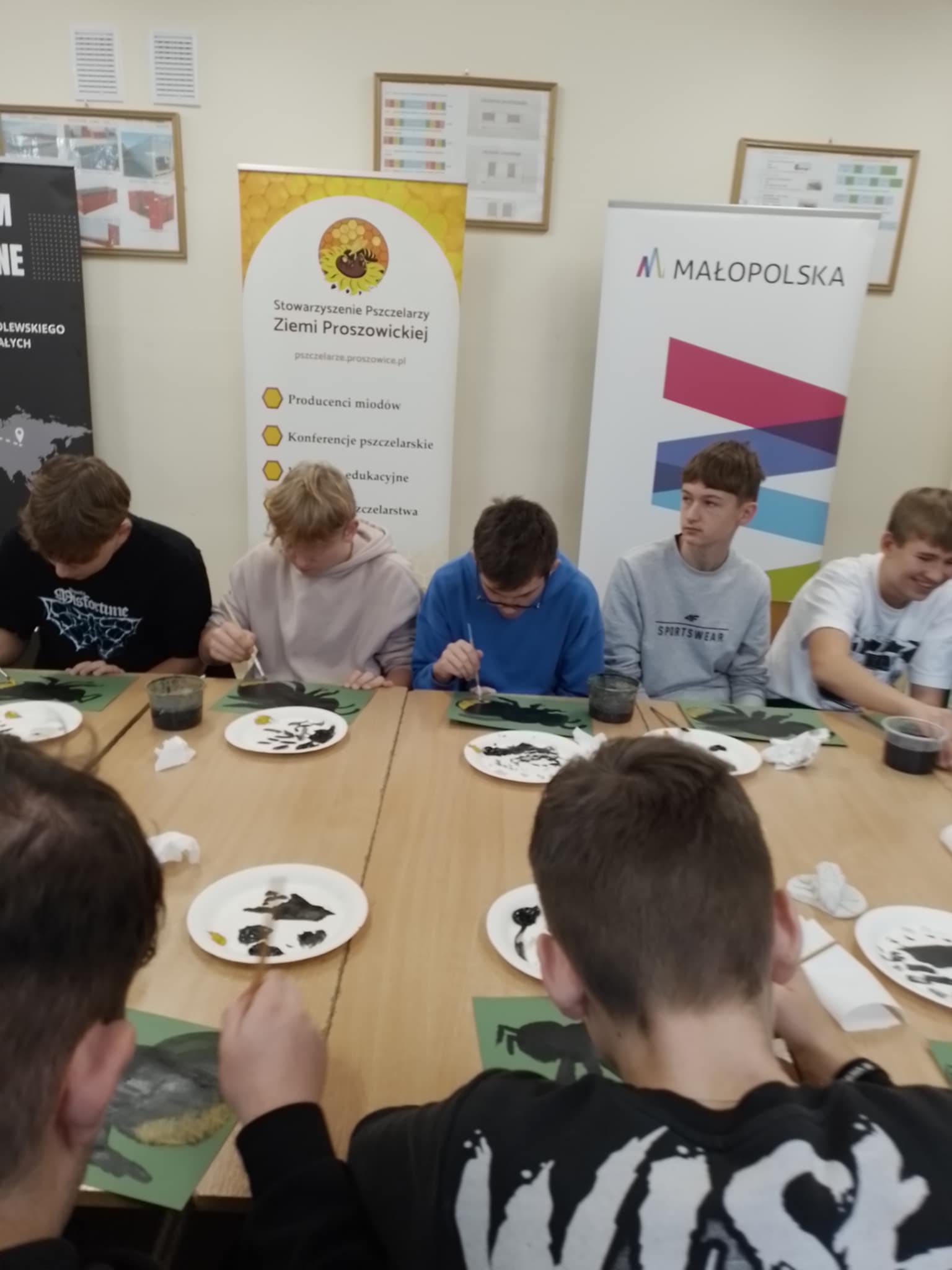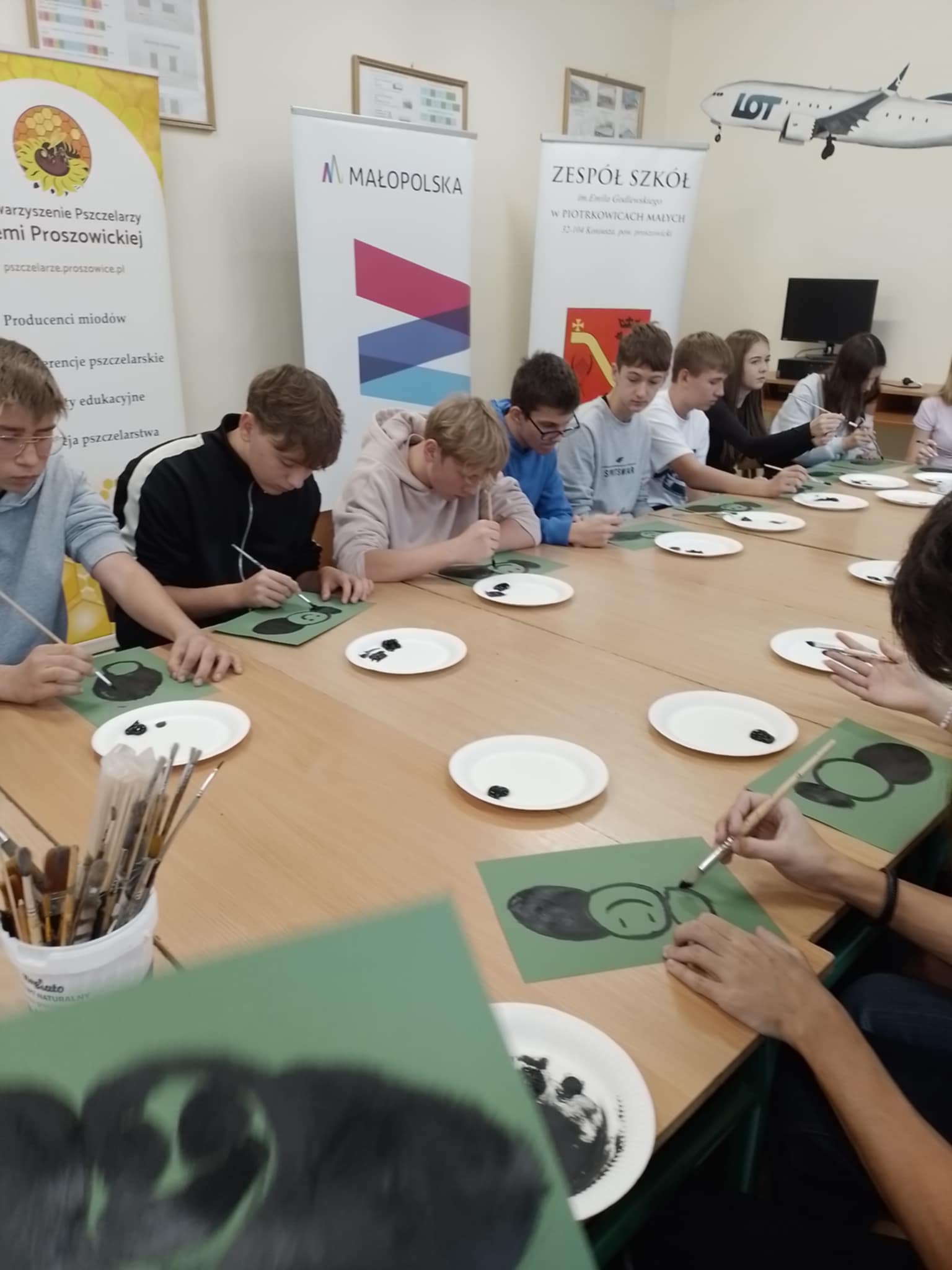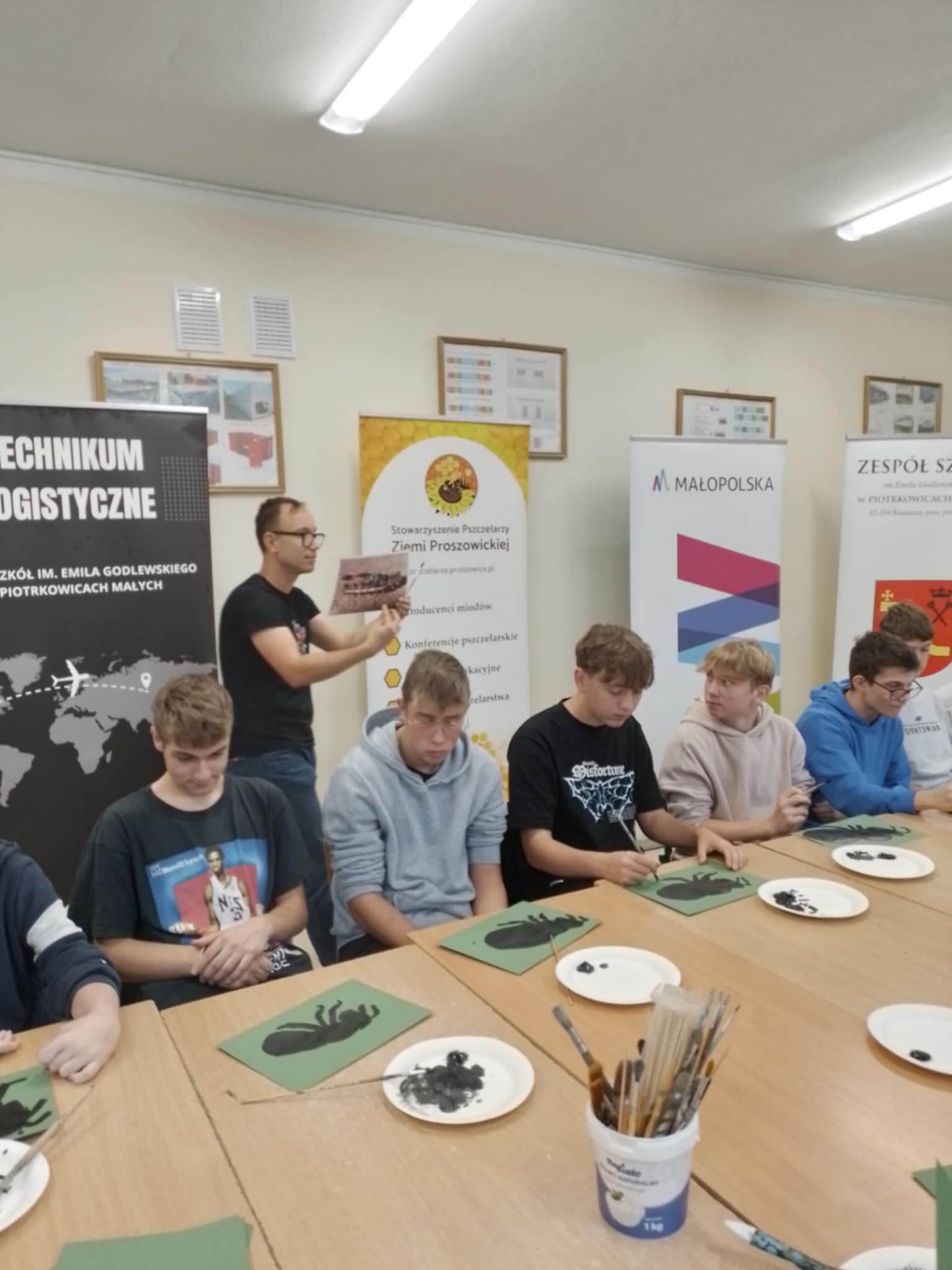 22 października 2025 roku w Zespole Szkół w Piotrkowicach Małych odbyły się warsztaty i prelekcja zorganizowane przez Stowarzyszenie Pszczelarzy Ziemi Proszowickiej. W zajęciach uczestniczyli uczniowie klasy 1C technikum logistycznego. Podczas spotkania młodzież miała okazję poszerzyć swoją wiedzę na temat roli zapylaczy w środowisku naturalnym, ich ogromnego znaczenia dla przyrody oraz potrzeby ochrony tych pożytecznych owadów. Uczestnicy poznali również przykłady dobrych praktyk, które każdy z nas może wdrażać, aby wspierać dzikie zapylacze. Pod kierunkiem pana Michała Molickiego uczniowie wzięli udział w części plastycznej warsztatów, podczas której malowali trzmiela, jednego z najważniejszych dzikich zapylaczy. Zajęcia przebiegały w miłej i twórczej atmosferze, a uczestnicy wykazali się dużym zaangażowaniem i kreatywnością. Serdecznie dziękujemy pani Małgorzacie Pokornik oraz panu Michałowi Molickiemu za zorganizowanie i przeprowadzenie tego ciekawego oraz inspirującego spotkania.