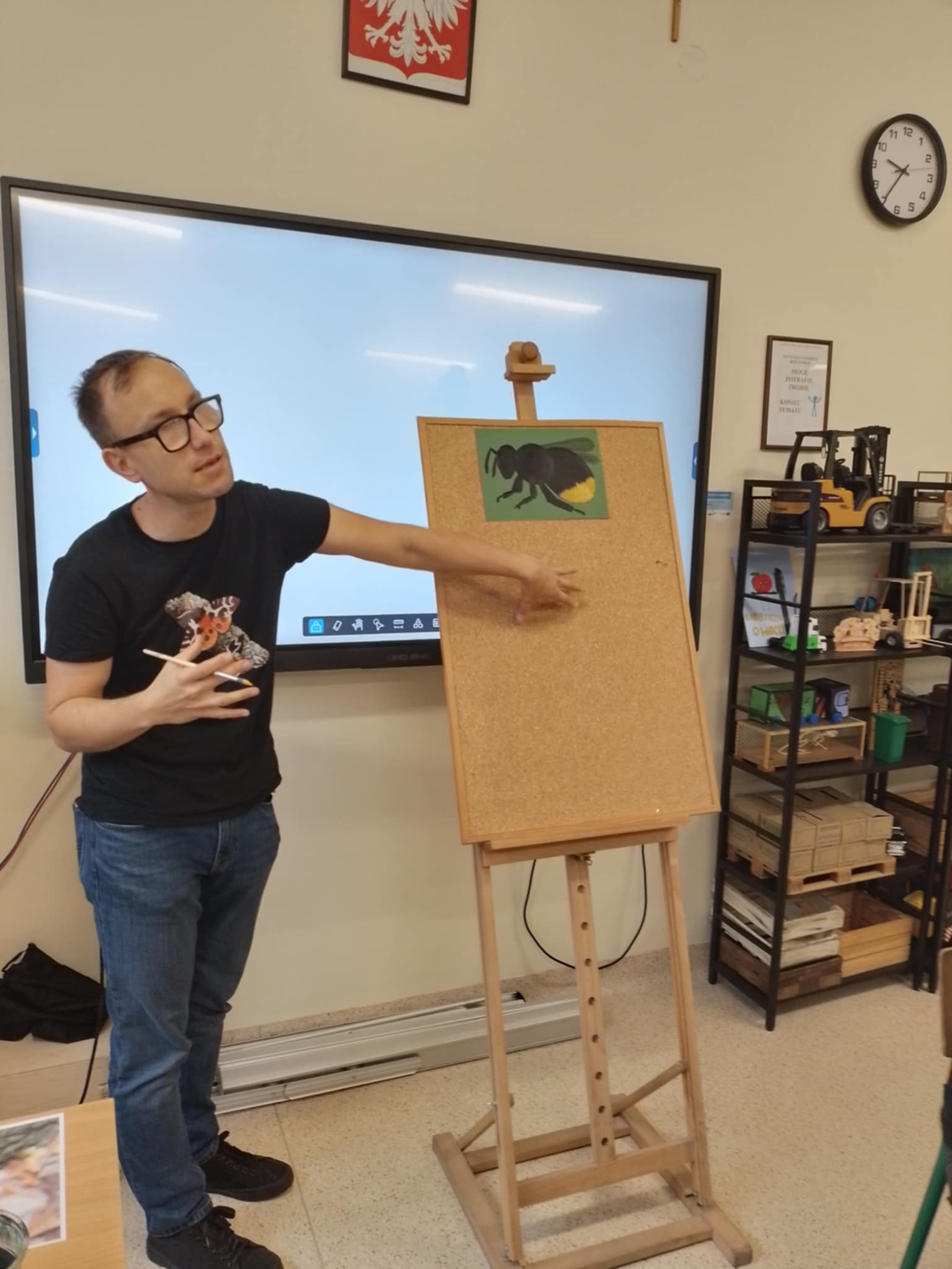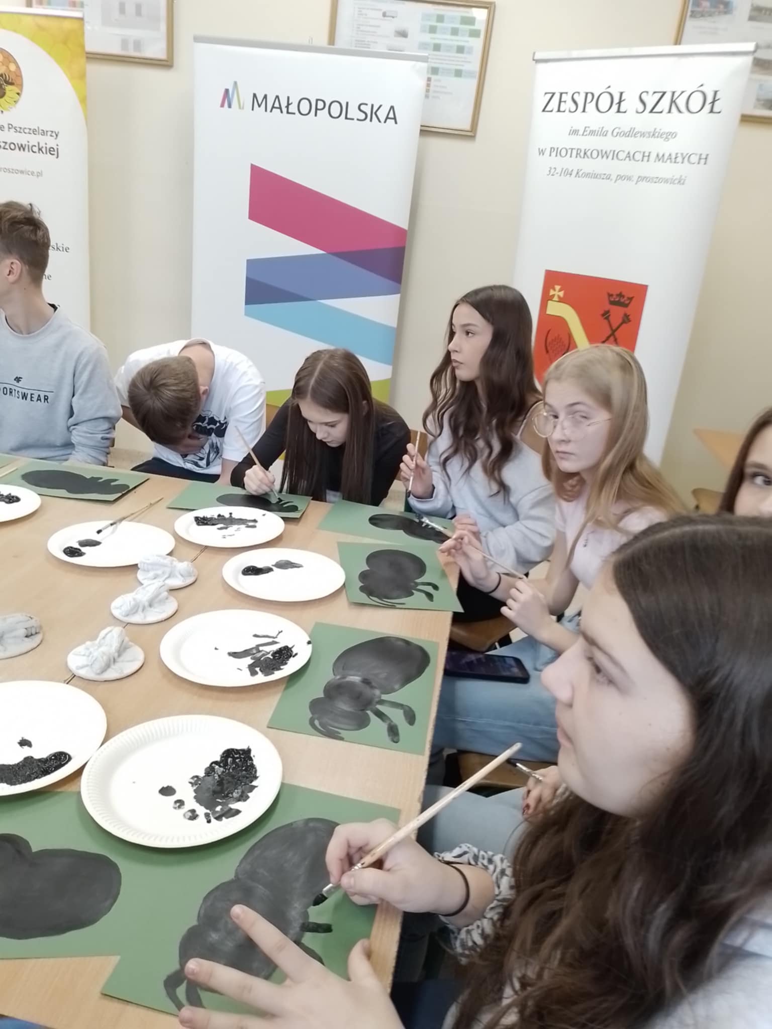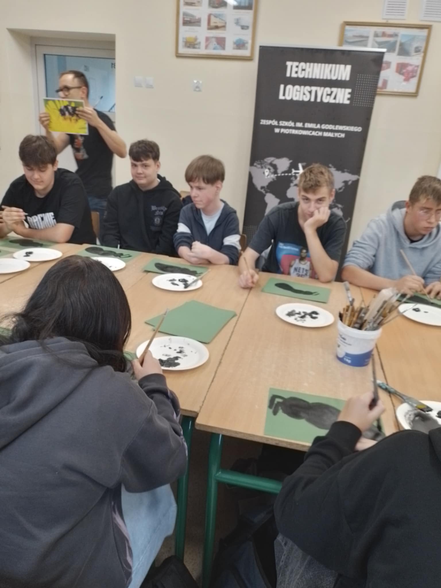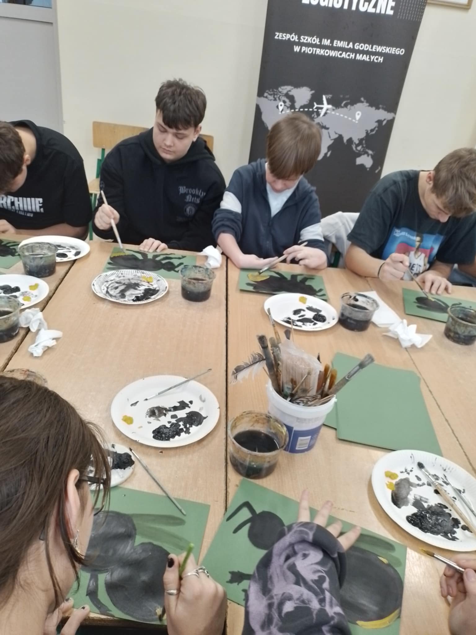 22 października 2025 roku w Zespole Szkół w Piotrkowicach Małych odbyły się warsztaty i prelekcja zorganizowane przez Stowarzyszenie Pszczelarzy Ziemi Proszowickiej. W zajęciach uczestniczyli uczniowie klasy 1C technikum logistycznego. Podczas spotkania młodzież miała okazję poszerzyć swoją wiedzę na temat roli zapylaczy w środowisku naturalnym, ich ogromnego znaczenia dla przyrody oraz potrzeby ochrony tych pożytecznych owadów. Uczestnicy poznali również przykłady dobrych praktyk, które każdy z nas może wdrażać, aby wspierać dzikie zapylacze. Pod kierunkiem pana Michała Molickiego uczniowie wzięli udział w części plastycznej warsztatów, podczas której malowali trzmiela, jednego z najważniejszych dzikich zapylaczy. Zajęcia przebiegały w miłej i twórczej atmosferze, a uczestnicy wykazali się dużym zaangażowaniem i kreatywnością. Serdecznie dziękujemy pani Małgorzacie Pokornik oraz panu Michałowi Molickiemu za zorganizowanie i przeprowadzenie tego ciekawego oraz inspirującego spotkania.